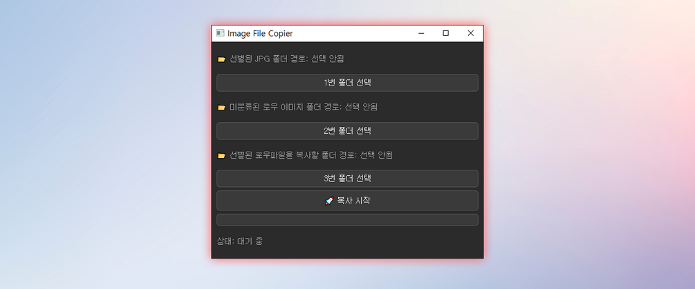 - "3번 폴더 선택" 버튼을 눌러 선별된 RAW 파일들을 복사할 대상 폴더를 선택합니다.